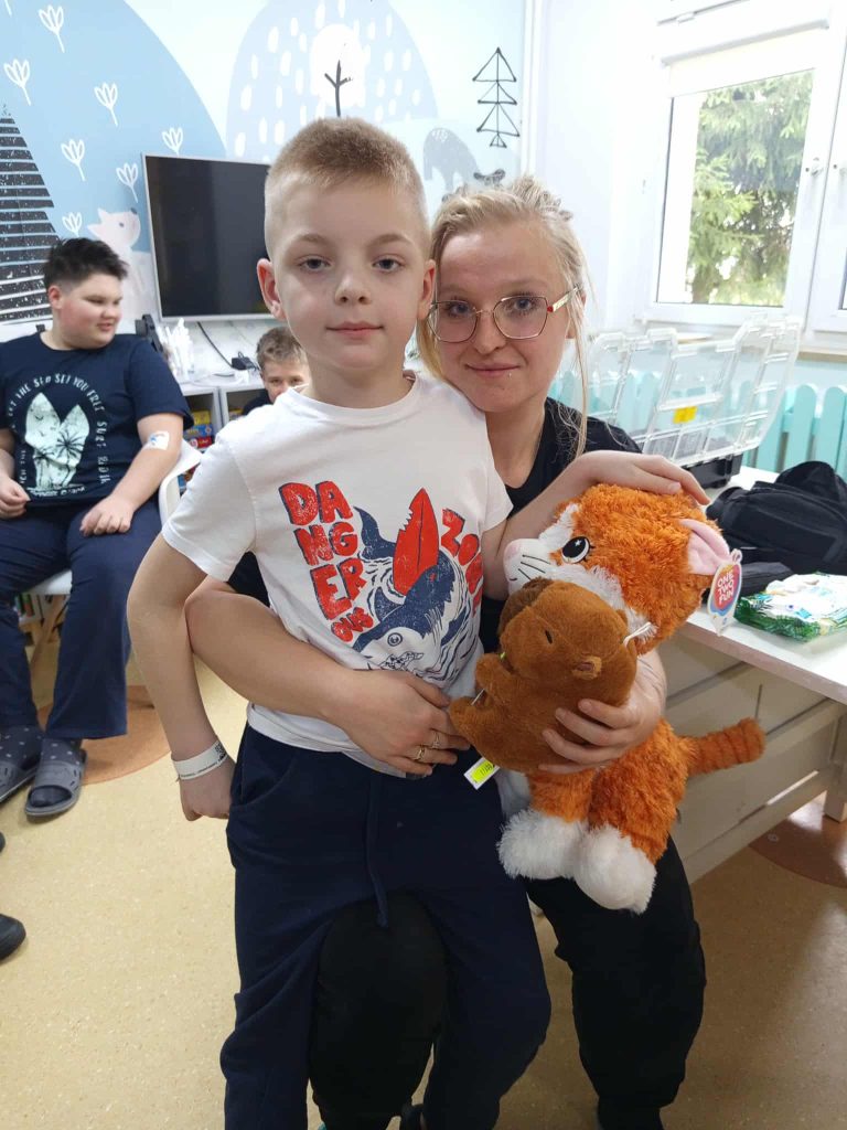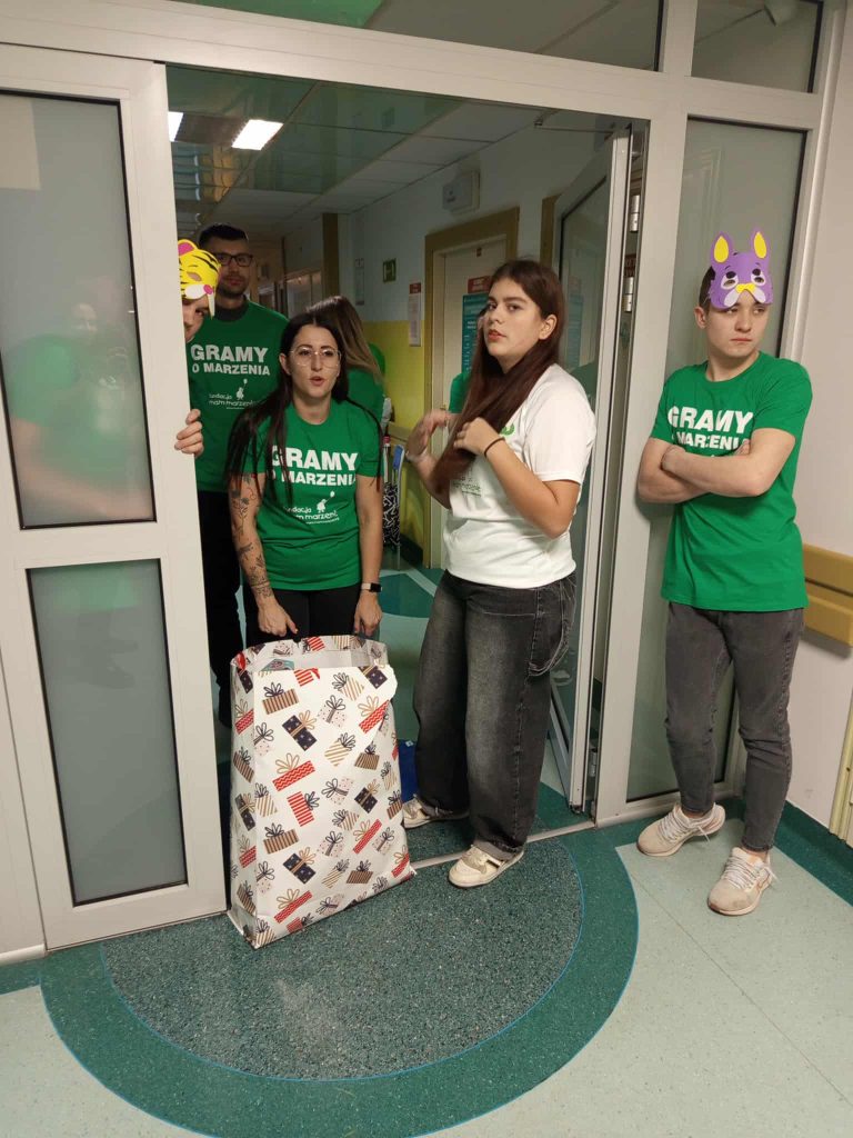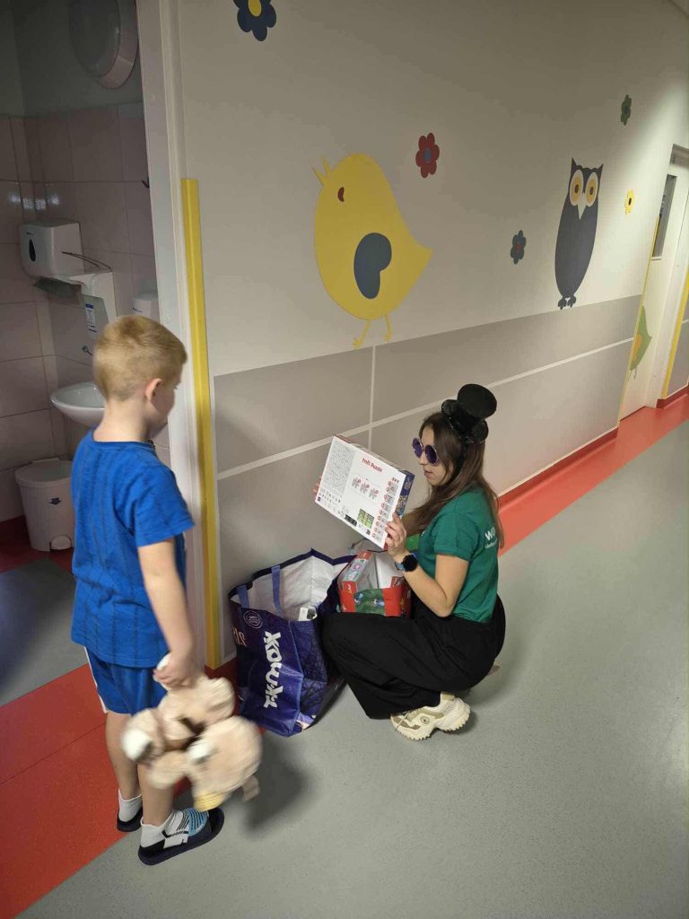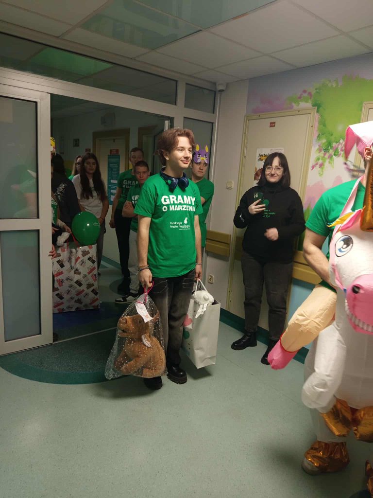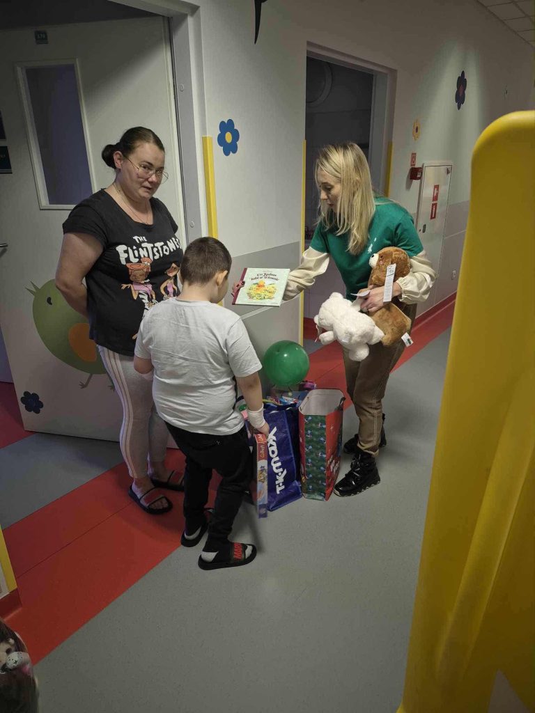 Na oddziale dziecięcej onkologii przekazaliśmy małym pacjentom indywidualne prezenty szykowane dzień wcześniej dla konkretnych dzieci. I to właśnie tam wydarzyły się te „małe cudy”, których nie planuje się w harmonogramie: rozmowy, które poruszają bardziej, niż człowiek się spodziewa, – uśmiech dziecka, które jeszcze sekundę wcześniej było nieśmiałe, wdzięczność rodziców, której nie da się opisać, personel, który z życzliwością jak z innego świata pomaga w każdym kroku. A kiedy w nasze ręce trafiła przepiękna, ręcznie wykonana laurka… nasze wzruszenie sięgnęło zenitu. Poczuliśmy, że dzieci naprawdę na nas czekały. Potem zeszliśmy o jedno piętro — a jakby do zupełnie innego świata: oddział endokrynologiczny, kolejne dzieci, kolejne historie, kolejne emocje. Dalej zawieźliśmy prezenty do dwóch placówek opiekuńczo – wychowawczych i dziecięcego szpitala psychiatrycznego, gdzie drobny gest potrafi rozjaśnić cały dzień.