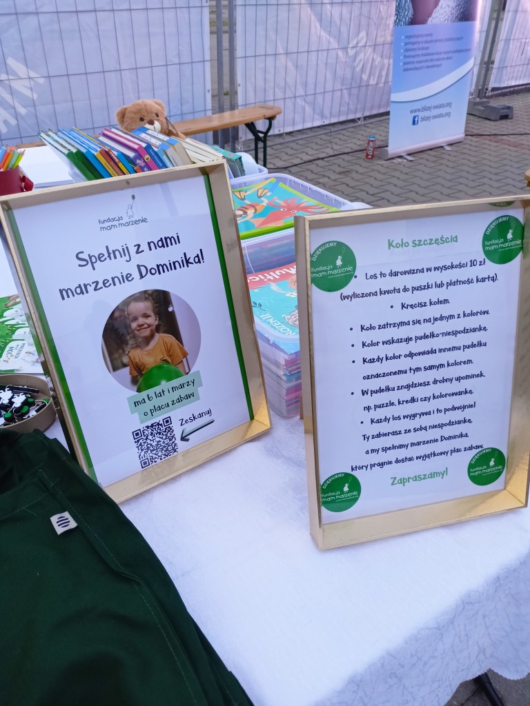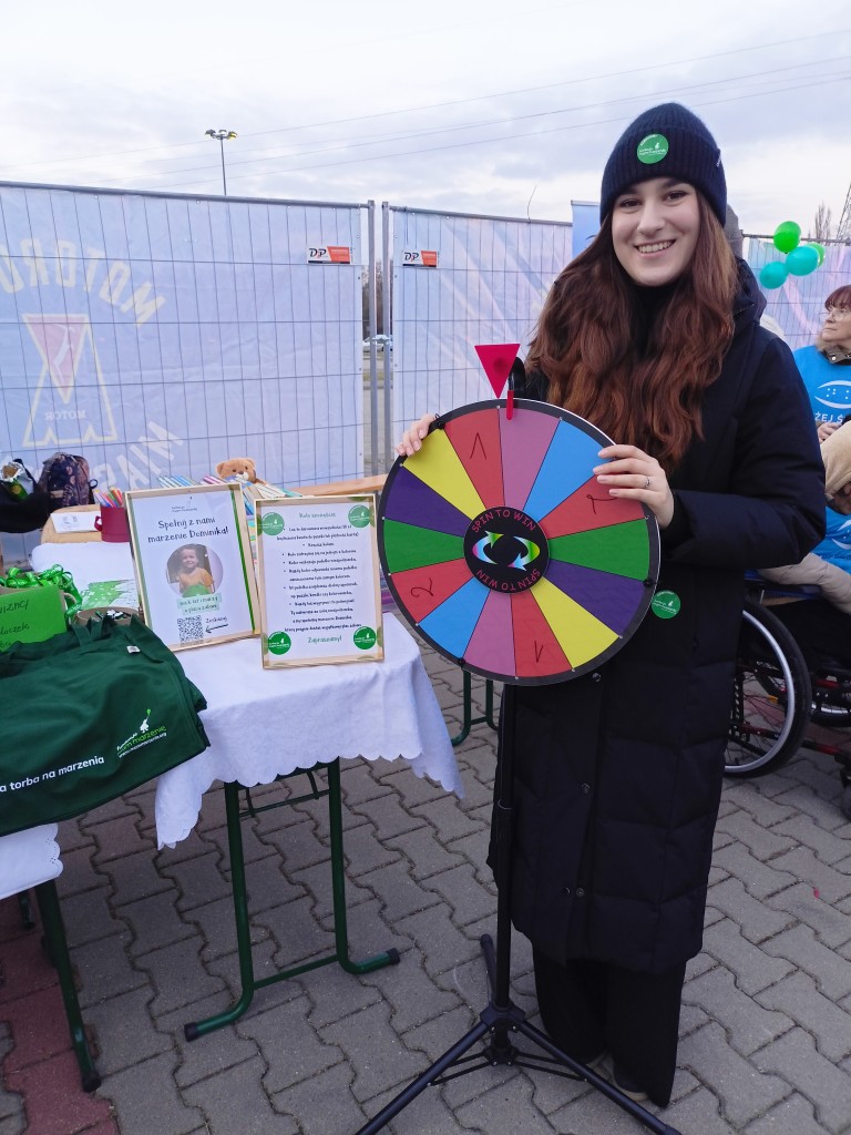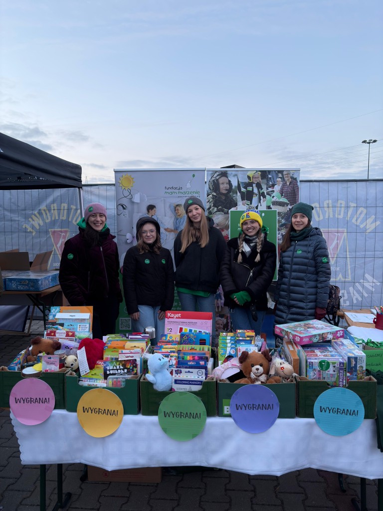 Jako wolontariusze Fundacji Mam Marzenie zorganizowaliśmy zabawę „Koło szczęścia”. Uczestnicy, po przekazaniu darowizny w wysokości 10 zł mogli zakręcić kołem i wylosować nagrodę: kredki, flamastry, plastelinę, pluszaka, puzzle lub kolorowankę.