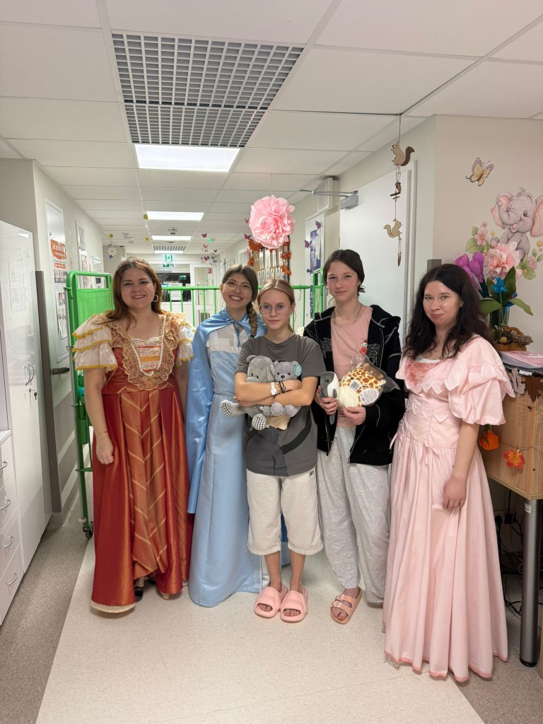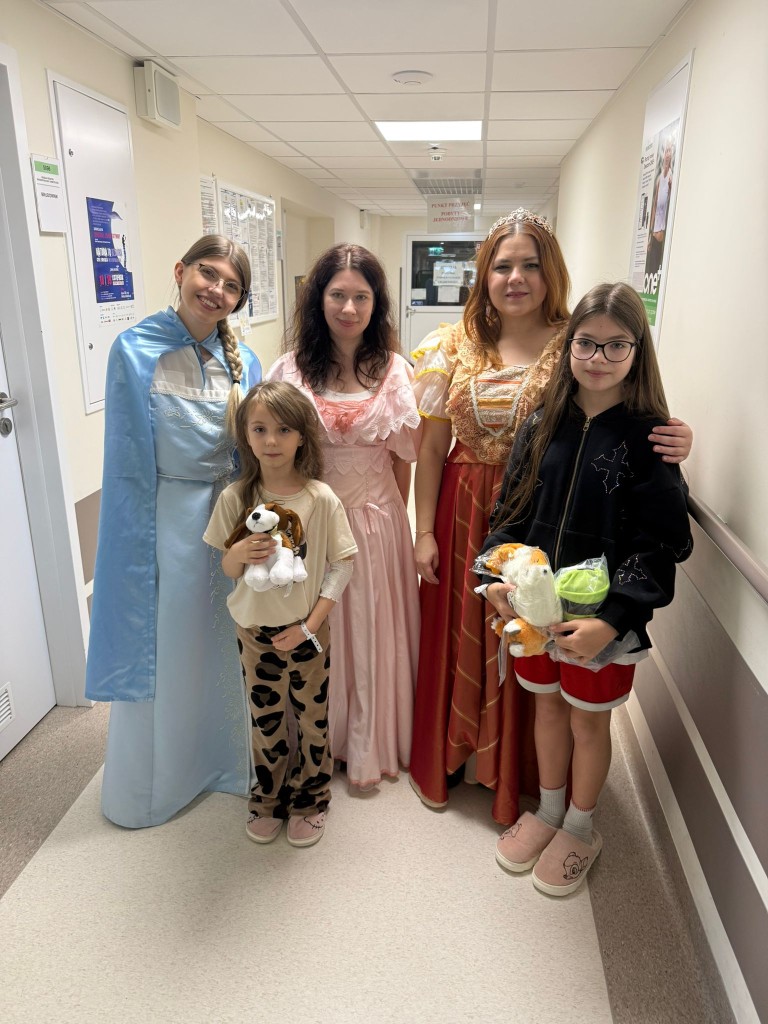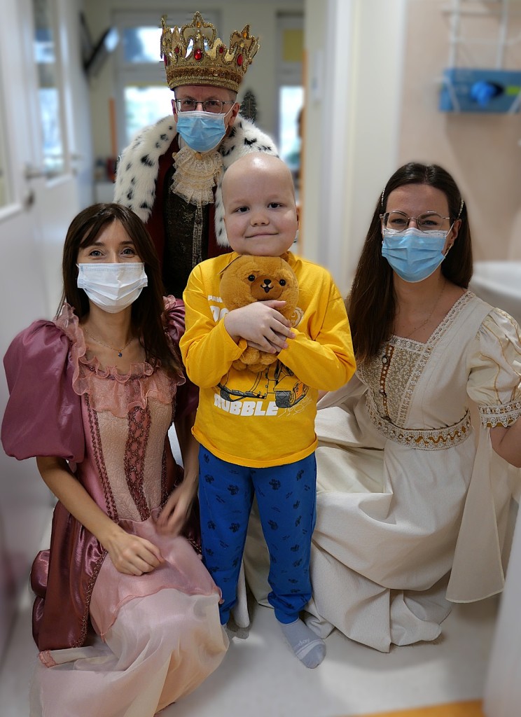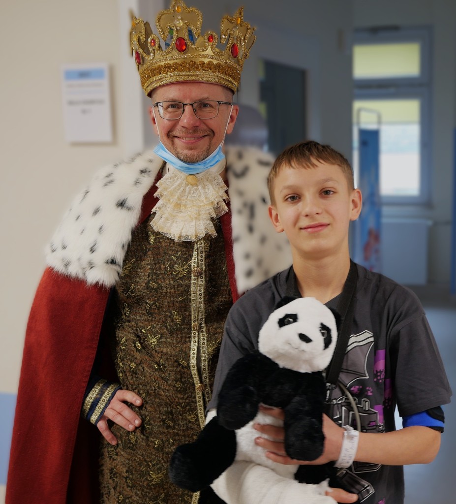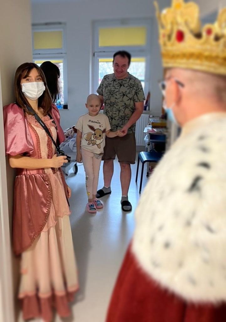W tym roku postanowiliśmy odwiedzić dzieci w wyjątkowej, bajkowej odsłonie. Wolontariuszki zamieniły się w księżniczki przebrane w suknie pełne cekinów, tiuli, błyszczących falban i koronek. A w tak szlachetnym towarzystwie oczywiście nie mogło zabraknąć Króla! W królewskich pelerynie i koronie majestatycznie przemierzał szpitalne korytarze, wywołując szerokie uśmiechy na twarzach małych pacjentów. Dzieci reagowały cudownie–robiły sobie z nami zdjęcia, przytulały się, przybijały piątki i nie mogły uwierzyć, że taka bajkowa niespodzianka spotkała je właśnie dziś.