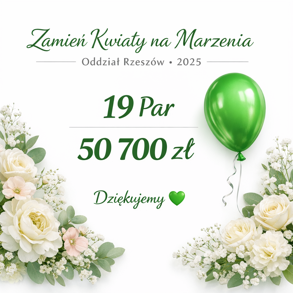 Końcówka roku to dla nas czas refleksji i wdzięczności. Z ogromną radością dzielimy się podsumowaniem tegorocznej edycji akcji „Zamień Kwiaty na Marzenia” w Oddziale Rzeszów. W minionym sezonie ślubnym do naszej inicjatywy dołączyło aż 19 par młodych, które w swoim wyjątkowym dniu postanowiły podzielić się szczęściem z naszymi Marzycielami.[...]