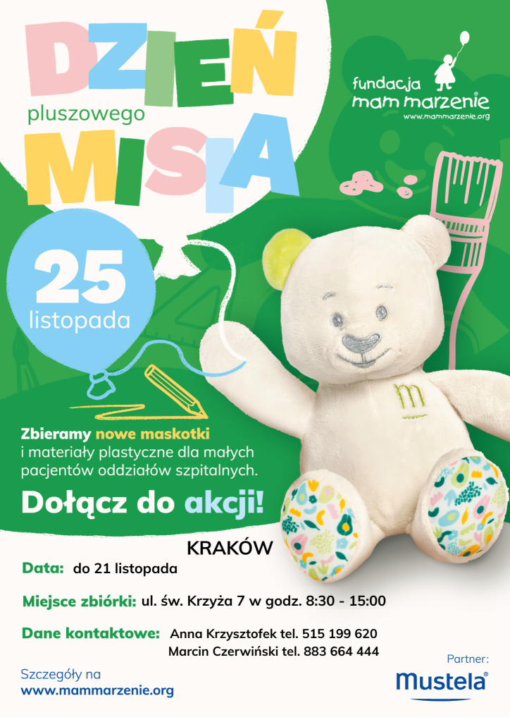 Od kilku lat w listopadzie Fundacja Mam Marzenie organizuje zbiórkę nowych pluszowych maskotek, gier, zabawek oraz materiałów plastycznych dla małych pacjentów oddziałów onkologicznych. Okazją do przeprowadzenia zbiórki jest obchodzony 25 listopada Międzynarodowy Dzień Pluszowego Misia. Udział w naszej akcji mogą wziąć wszyscy: osoby prywatne, szkoły, firmy, instytucje państwowe. Ważne, aby zbierane były jedynie nowe maskotki, które mogą trafić na oddziały onkologiczne. Używane maskotki nawet uprane nie będą mogły trafić do dzieci. Oprócz nowych maskotek można również przekazywać gry planszowe, książki oraz materiały plastyczne, które[...]